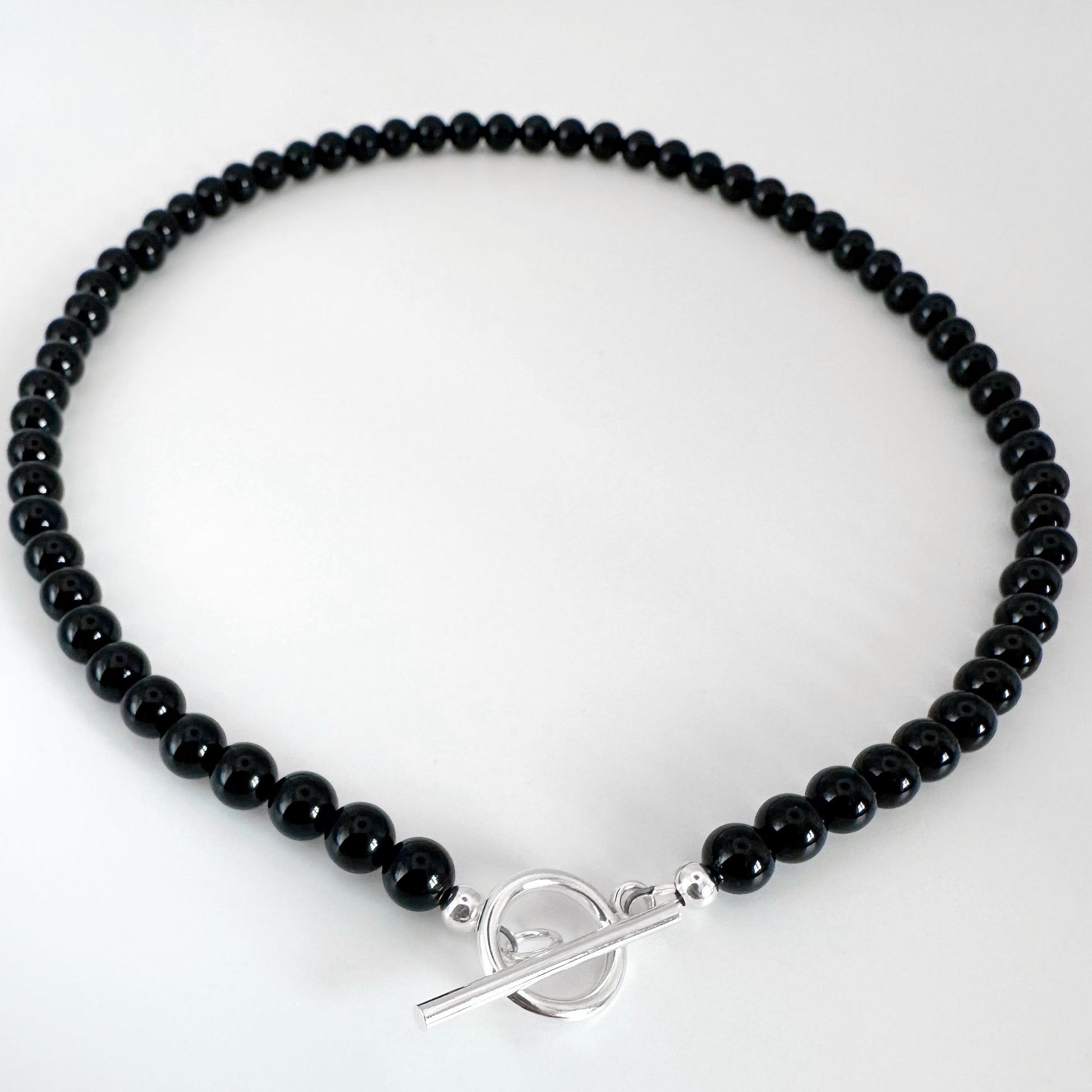 Elevate your everyday style with this elegant black onyx necklace. Featuring smooth, round black onyx beads finished with a handmade sterling silver T-bar clasp. This piece can be worn with the clasp positioned at the front for a modern, design-led look, or at the back for a more traditional, seamless finish. This versatile detail allows you to style the necklace to suit your outfit and occasion.