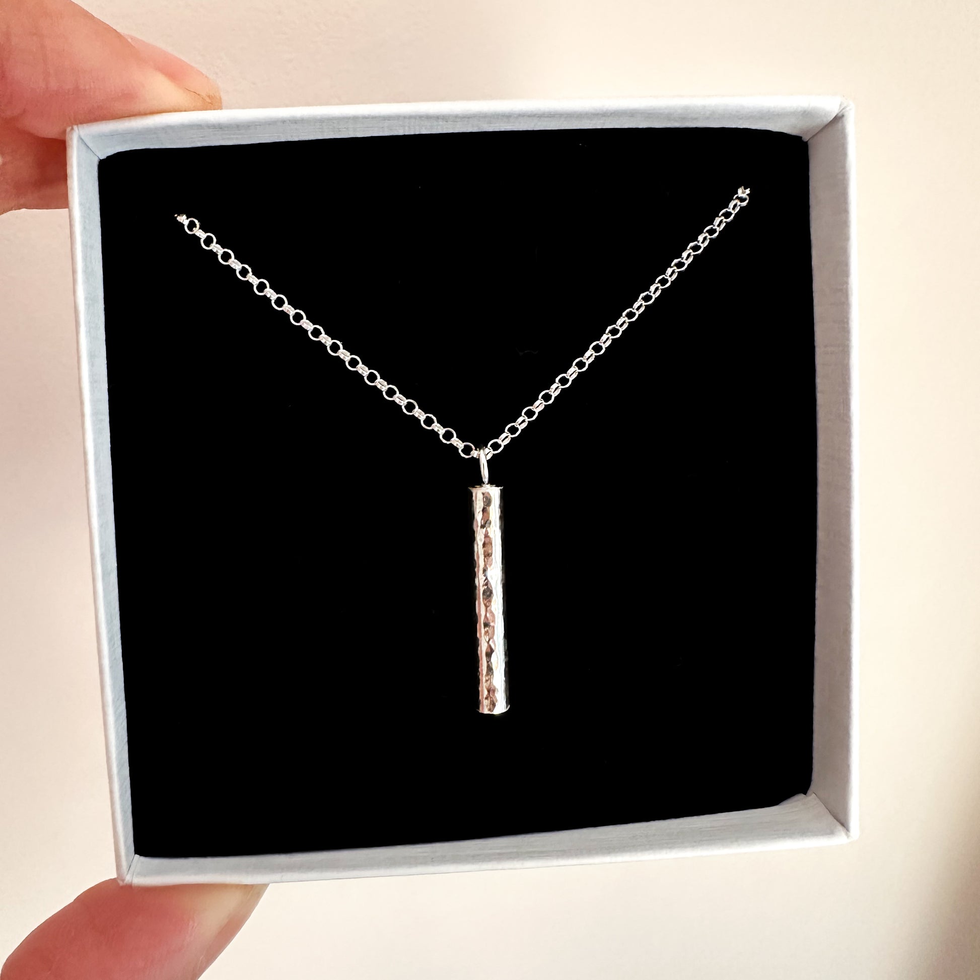 Discover timeless simplicity with this handmade hammered sterling silver bar necklace. Each piece is crafted by hand from D-shaped sterling silver, creating a beautifully textured bar pendant that catches and reflects the light with every movement.